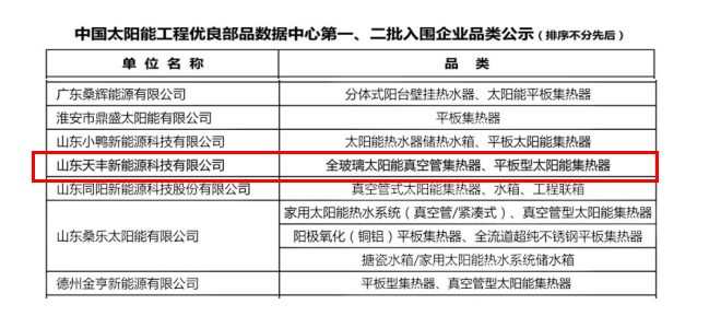 2018年10月,全國首個(gè)“中國太陽能工程優(yōu)良部品數(shù)據(jù)中心”成立,山東天豐新能源科技有限公司太陽能系列產(chǎn)品成功首批入圍!