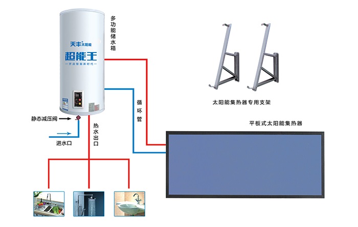 本系統(tǒng)采用天豐陽(yáng)臺(tái)壁掛分體式太陽(yáng)能熱水機(jī),吸熱部件(太陽(yáng)能集熱器)與儲(chǔ)熱部件(水箱)分離式安裝,集熱器安裝于南面陽(yáng)臺(tái)上,儲(chǔ)熱部件(水箱)安裝于室內(nèi)陽(yáng)臺(tái)上,然后通過(guò)管路把太陽(yáng)能集熱器、水箱和室內(nèi)衛(wèi)生間、廚房等用熱設(shè)備相連接的一種分戶集熱、分戶儲(chǔ)熱式太陽(yáng)能熱水系統(tǒng),整個(gè)系統(tǒng)為承壓式運(yùn)行,間接加熱。