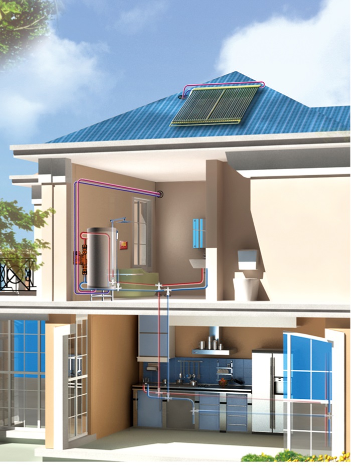 本系統(tǒng)采用天豐分體式太陽(yáng)能熱水機(jī),吸熱部件(太陽(yáng)能集熱器)與儲(chǔ)熱部件(水箱)分離式安裝,集熱器安裝于屋面(或陽(yáng)臺(tái)、南立面墻等)位置,儲(chǔ)熱部件(水箱)安裝于室內(nèi)設(shè)備間,然后通過(guò)管路把太陽(yáng)集熱器、水箱和室內(nèi)衛(wèi)生間、廚房等用熱設(shè)備相連接的一種分戶集熱、分戶儲(chǔ)熱式太陽(yáng)能熱水系統(tǒng),整個(gè)系統(tǒng)為承壓式運(yùn)行,間接加熱。